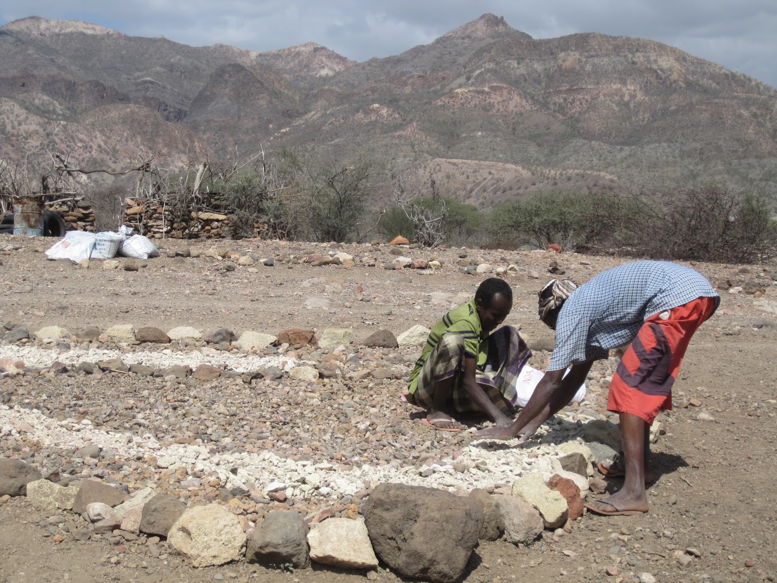 Sur les conseils de Daoud et de Jean Marie, il a été décidé de tracer des chemins entre les différents enclos, puis du village au trou à ordures, ainsi que du village au rucher, pour faciliter l’usage des brouettes et tous les transports.