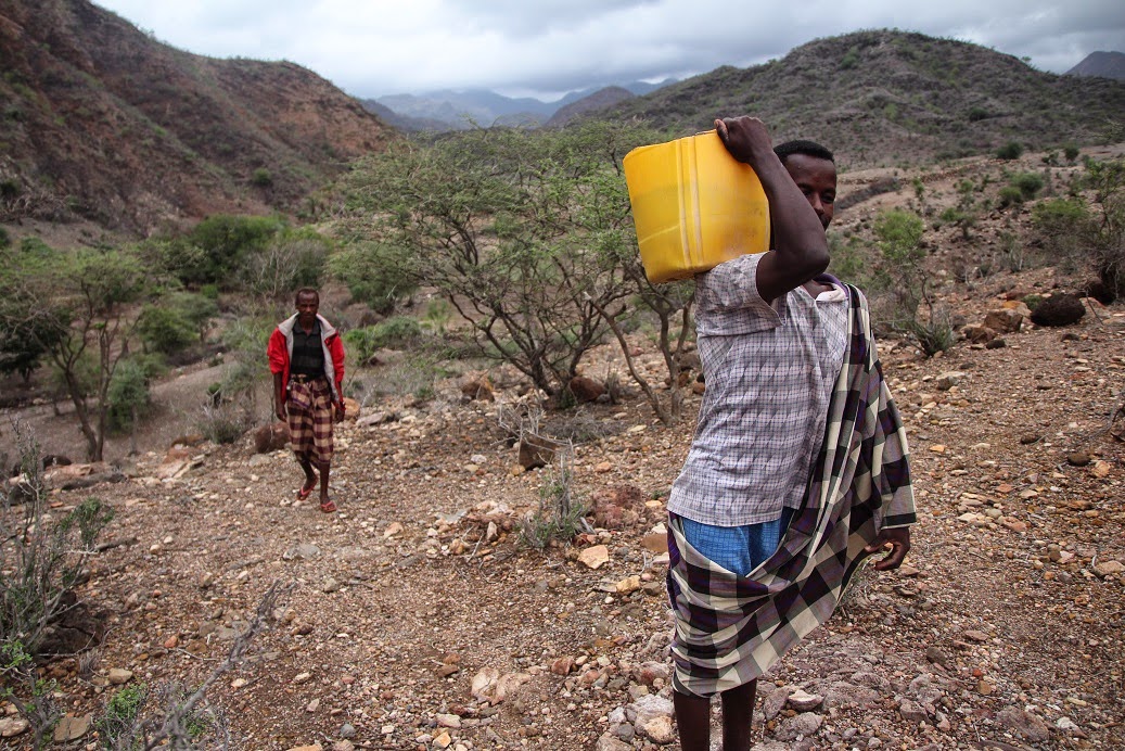 Il faut remplir les 40 bidons pour faire le béton de la citerne.
