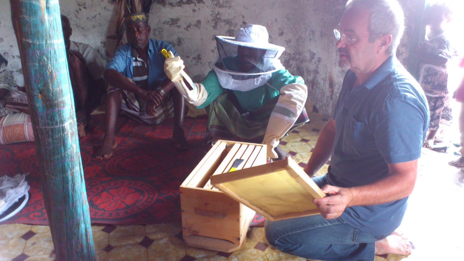 Après avoir équipé les ruches de cadres et de cire, nous créons un grand rucher, tourné vers l’Est, sur une colline dominant le village. Créer des plateformes, un enclos de branches pour le délimiter, un chemin d’accès, tout cela prend beaucoup de temps et d’énergie. Pour finir, nous finançons un gardien.